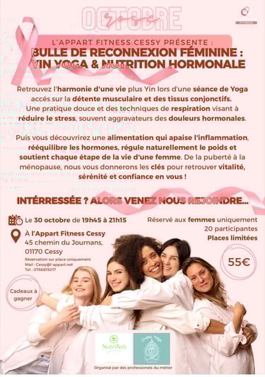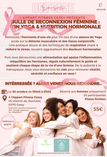 Le jeudi 30 octobre, LâAppart Fitness Cessy a accueilli un bel Ă©vĂ©nement en Ă©cho au mois Octobre Rose : une bulle de reconnexion fĂ©minine, organisĂ©e par Sabrina de NutriSab et Anne-Julie de Choka Yoga.